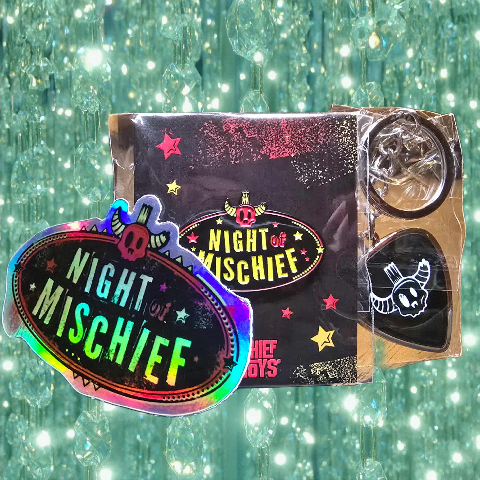 Night of Mischief 2025 pin, sticker, and keychain.